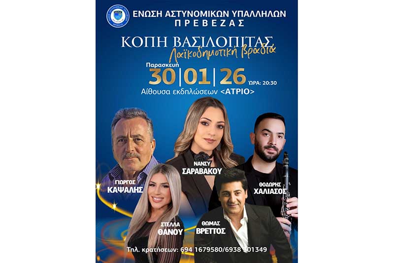 Η Ένωση Αστυνομικών Υπαλλήλων Πρέβεζας σας προσκαλεί στην κοπή της βασιλόπιτας που θα πραγματοποιηθεί την Παρασκευή, 30/01/2026 και ώρα 20:30 στην αίθουσα εκδηλώσεων «ΑΤΡΙΟ» στην Πρέβεζα, με λαϊκοδημοτικό πρόγραμμα και φαγητό. Θα μας δώσει ιδιαίτερη χαρά η παρουσία σας καθώς και των οικογενειών-φίλων σας.