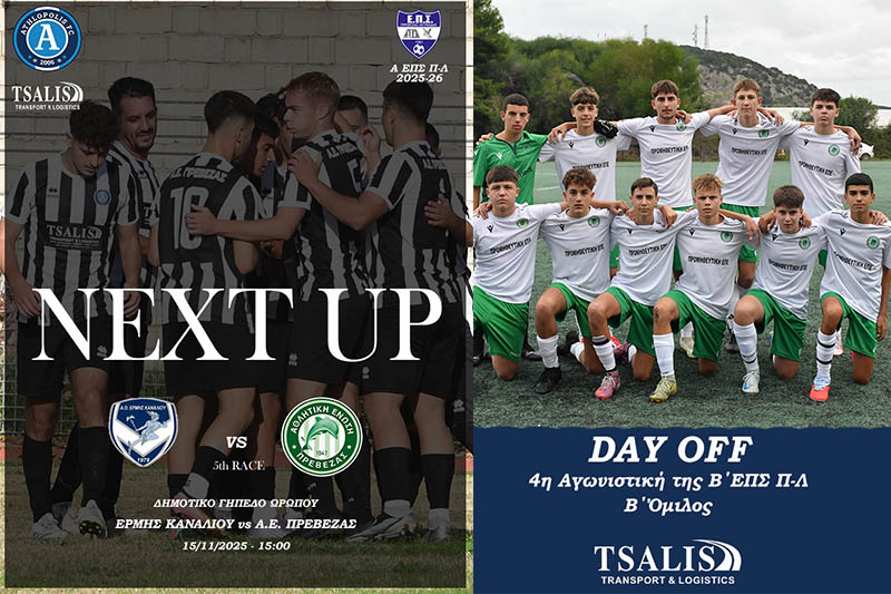 Το Σάββατο 15/11 η Α.Ε. Πρέβεζας θα αντιμετωπίση τον Ερμή Καναλίου για την 5η αγωνιστική της Α΄ ΕΠΣ Πρέβεζας-Λευκάδας ενώ η Α.Ε. Πρέβεζας Β΄ έχει ρεπο στην 4η στροφή της Β΄ ΕΠΣ.