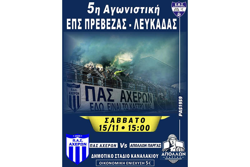 Το Σάββατο 15 Νοεμβρίου 2025, στις 15:00, ο ΠΑΣ Αχέρων Καναλακίου υποδέχεται τον Απόλλωνα Πάργας για την 5η αγωνιστική του πρωταθλήματος της Α’ ΕΠΣ Πρέβεζας-Λευκάδας, σε μια αναμέτρηση γεμάτη ιστορία, ένταση και συναίσθημα.